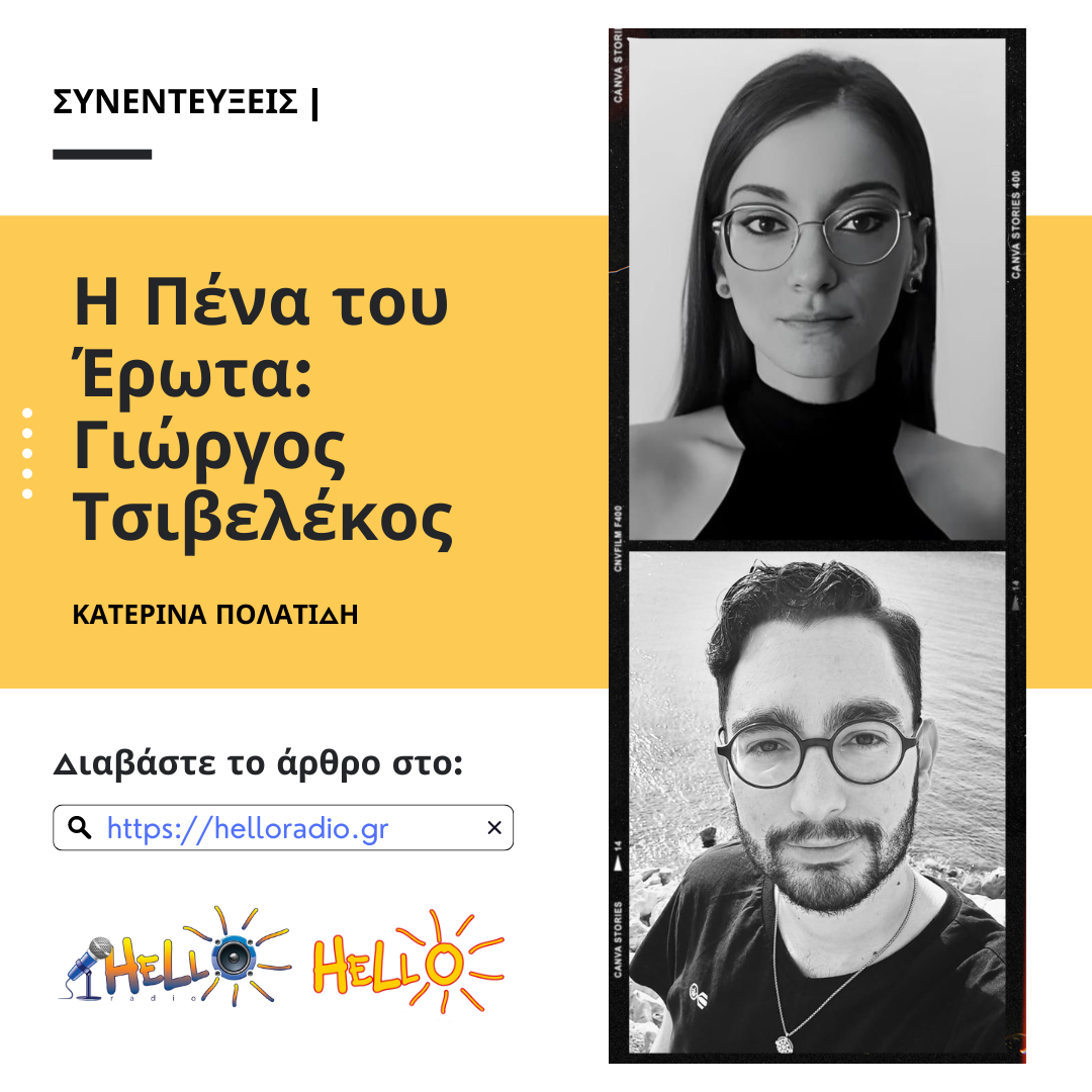 Έχουμε τη χαρά και την τιμή να εγκαινιάζουμε τη νέα στήλη συνεντεύξεων του Hello Radio με πρώτο καλεσμένο μας τον πολυπράγμων και πολυτάλαντο σύγχρονο λογοτέχνη, Γιώργο Τσιβελέκο. Το θέμα του μήνα είναι «Η Πένα του Έρωτα», γι’ αυτό δε θα μπορούσαμε να επιλέξουμε καλύτερο “ποδαρικό” από τον Γιώργο! Ο Γιώργος, εκτός από όλα όσα θα μας πει στη συνέχεια για τον εαυτό του, συνεργάζεται μαζί μας από τον Ιανουάριο του 2024 ως αρθρογράφος στη στήλη Πολιτισμού. Πρόκειται να μας χαρίσει από εδώ και στο εξής αμέτρητες γνώσεις και λυρικά ταξίδια μέσα από την πολύχρωμη και μελωδική πένα του.